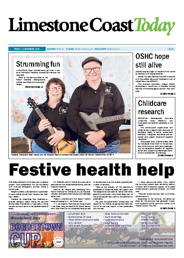 Limestone Coast Today – 12th December 2025 Subscribe or Login to see the rest of the content. Username Password * Remember Me Forgot Password News Ladies Triples Championship entertains 17/12/2025 LAST Wednesday the Penola Bowls Club held its Ladies Championship Triples, with a tight contest ensuing. Meredith Hinze, Kaye Batt and Maria Hunter claimed the... Count-back galore in Saturday competition 17/12/2025 A MILD summer's day saw 23 women tee up in the third round of the Blue Lake Golf Club's summer cup played in stroke... Rock on the Rails hits a high note 16/12/2025 After a few weeks of recovering from Rock on the Rails, the event has been deemed a massive hit for locals and visitors alike. Event...