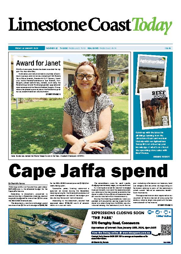 Limestone Coast Today – 16th January 2026 Subscribe or Login to see the rest of the content. Username Password * Remember Me Forgot Password News Strong start to the year for Riddoch 27/01/2026 THE Riddoch Arts and Cultural Centre is gearing up for a huge 2026 with the launch of its annual exhibition program packed full of... Anglers hit the coast on hot weekend 27/01/2026 A HOT Australia Day long weekend across the Limestone Coast saw plenty of anglers head for the water. From offshore to inland, off the... Men’s triples well contested 27/01/2026 THE Mount Gambier RSL and District Bowling Club recently held its Men’s Triples Championship. With good numbers and a quality field the winners were Michael...