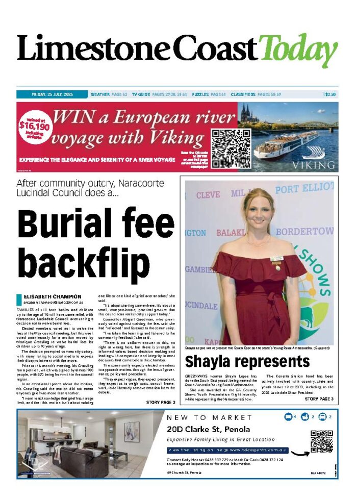 Limestone Coast Today – 25th July 2025 Subscribe or Login to see the rest of the content. Username Password * Remember Me Forgot Password News Women record top scores at Blue Lake course 17/12/2025 A HANDFUL of great scores were recorded at the Blue Lake golf course last week when 26 women competed in a stableford competition. Dominating the... Ladies Triples Championship entertains 17/12/2025 LAST Wednesday the Penola Bowls Club held its Ladies Championship Triples, with a tight contest ensuing. Meredith Hinze, Kaye Batt and Maria Hunter claimed the... Count-back galore in Saturday competition 17/12/2025 A MILD summer's day saw 23 women tee up in the third round of the Blue Lake Golf Club's summer cup played in stroke...
