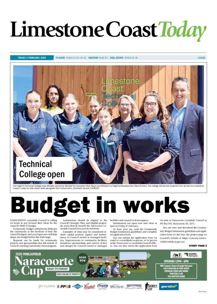 Limestone Coast Today – 6th February 2026 Subscribe or Login to see the rest of the content. Username Password * Remember Me Forgot Password News Limestone Coast Police wrap-up 05/02/2026 MAN ARRESTED AT TUMBY BAY A Mount Gambier/Berrin man has been arrested after he fled from Police in Tumby Bay. Highway Patrol officers stopped a silver... Ladies golf season begins with Summer Cup 05/02/2026 The weather was excellent and resulted in really good scoring for 15 Ladies to register 36 points or more last Wednesday at the Mount... A bit of everything on the bite 05/02/2026 A bit of everything hit the Limestone Coast over the weekend. From sun, to cloud cover, a bit of warmth and even some rain thrown...
