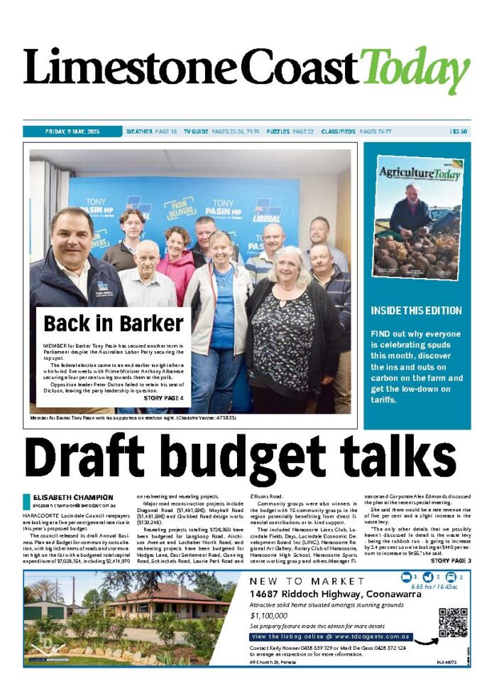 Limestone Coast Today – 9th May 2025 Subscribe or Login to see the rest of the content. Username Password * Remember Me Forgot Password News Bowlers gear up for Christmas break 15/12/2025 AS the Millicent Bowls Club gears up for its final competition prior to the Christmas break, last week's Night Owls competition was again well... Grand finalists locked in 14/12/2025 THE stage has now been set for the 2025 Limestone Coast Women's Football League grand finals, with Sunday's preliminary finals locking in the finalists. MUNDULLA... Fine and windy at Port MacDonnell 14/12/2025 THE South East Veterans golfers field was 49 at Port MacDonnell and while fine, it was windy. This shows up in the ball rundown,...