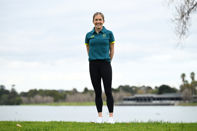 Jessica Stenson of Australia poses for a photograph during the announcement of the athletes selected to compete for Australia in the marathon at the Paris 2024 Olympic Games at Lakeside Stadium in Melbourne, Monday, June 3, 2024. (AAP Image/James Ross)
