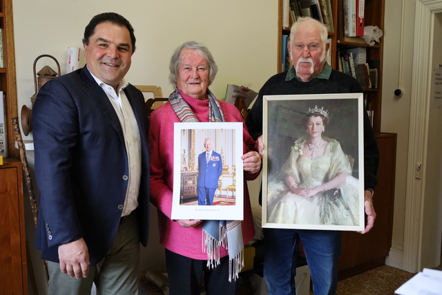 ROYALS IN PRINT: Barker MP Tony Pasin delivered a copy of King Charles' official portrait to Millicent Museum committee members Colleen Hammat and Jim Hyland who holds the museum's copy of the 'Wattle Queen'. (Caroline Hammat: 433010)