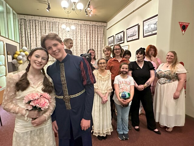 A LAUGH FOR ALL: Snow White's Holly Beer with her Prince Frederick Josh Halliday and fellow cast members celebrate opening night. (Charlotte Varcoe 449037)
