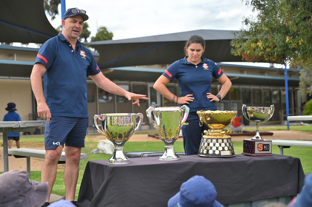 HISTORY IN THE MAKING: SANFL representatives Heath Sims and Katrice Turner educated students on how important the premiership cups were to the AFL and SANFL, including how they were made.