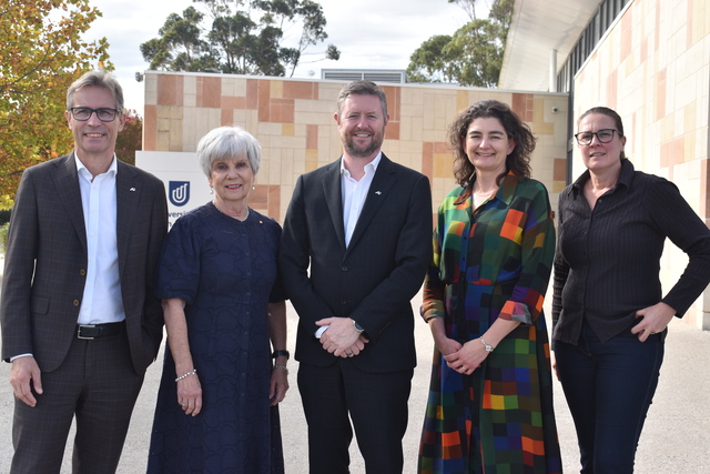 NEW UNI: Adelaide University co-vice chancellor Peter Hoj with City of Mount Gambier mayor Lynette Martin and co-vice chancellor David Lloyd, Mount Gambier/Berrin campus regional manager Peta Crewe and Green Triangle regional manager Tammy Auld. (Charlotte Varcoe 472630)