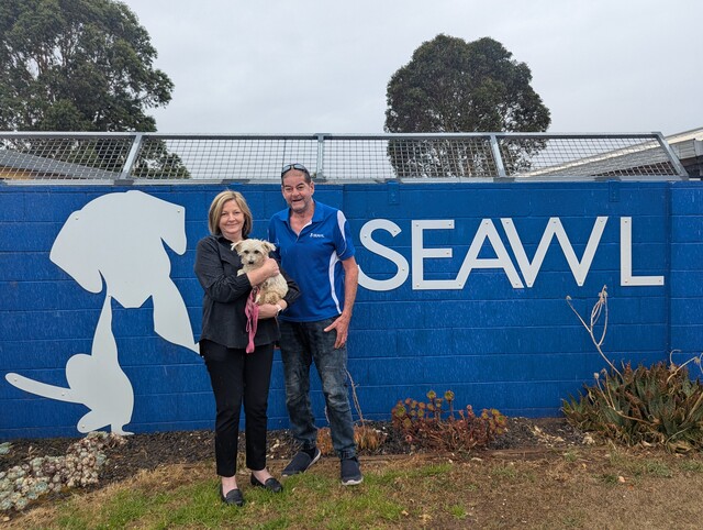 PARTNERSHIP: City of Mount Gambier general manager Corporate and Regulatory Services Jane Fetherstonhaugh and SEAWL president Trevor Twilley with 12.5 year old Bichon Frise Gemma. (Melanie Riley: 468238).