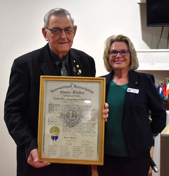 Newly installed Lions Club of Mount Gambier President Allen Woodham is presented with the club’s charter by Vice District Governor Margie Thomas. (Supplied)