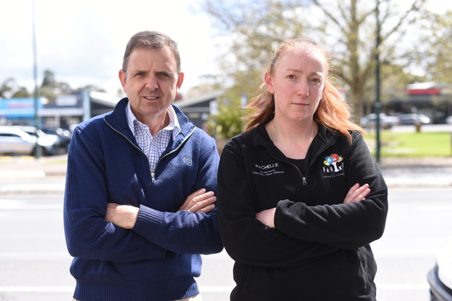 Member for MacKillop Nick McBride with parent Rachelle Fairs are calling for out of hours school care to be implemented back in Naracoorte. (Charlotte Varcoe 507793)