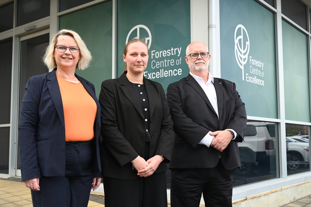 Minister for Forest Industries Clare Scriven, Green Triangle Forest Industries Hub (GTFIH) workforce development manager Lara Kroeger and GTFIH executive general manager Tony Wright celebrated Ms Kroeger's appointment to her new role, which aims to strengthen the forestry industry's workforce through education. (Tyler Redway: 513588)