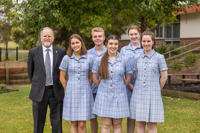 St Martin's Lutheran College principal Allan Connah with students Lillian Gillings, Christopher Mossford MacGregor, Lauren Agnew, Eva Peucker and Emily Meier. (Supplied)