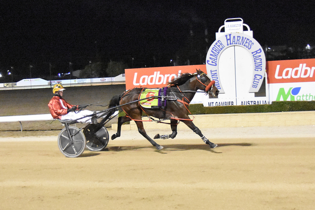 WINS ARE GETTING EASIER: At start number 187, veteran pacer Hilldale Sunrise chalked up career win number 13 in the easiest of fashion (by 25 metres) at the Greenwald Paceway last Friday night to give driver Lochie Cook the first leg of a winning treble. (James Murphy: 472761)