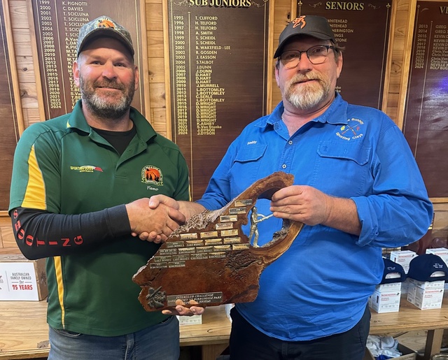 SEFGA president Scott Fleming received the Inter Club Challenge Trophy from Lake Bonney Shooting Clays vice president Craig Smith. (Supplied)