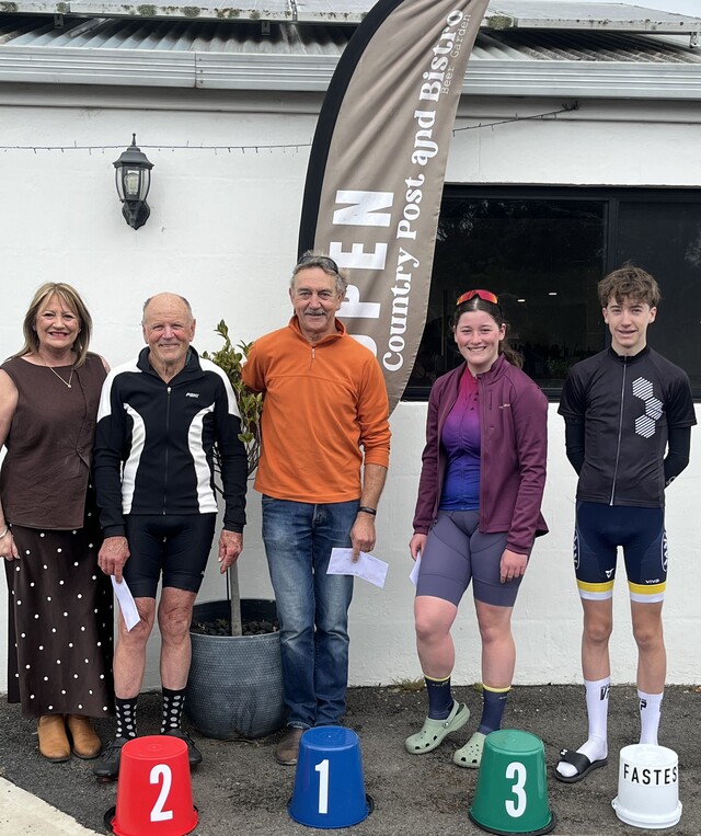 Sponsor Country Post and Bistro representative Julie, runner-up John Cranwell, winner John de Pree, third place Amelia Milne, fastest time Miles Kroon. (Supplied)