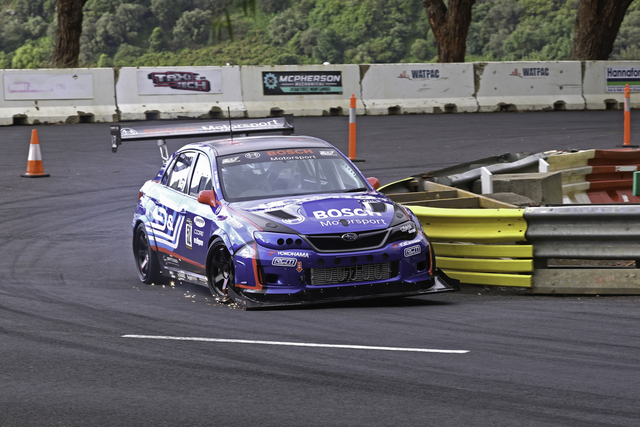 Sparks fly as Dan Day muscles his Subaru STi out of the bus stop chicane on his way to his 10th straight Legend of the Lakes hill climb title. (Turn8 Photography)