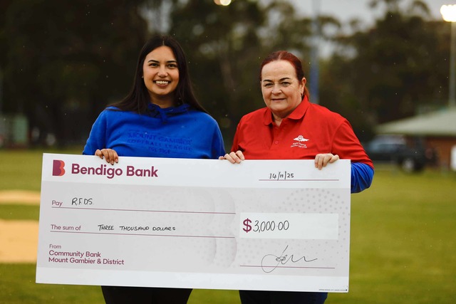 Mount Gambier Softball League president Kezia Feast presents Royal Flying Doctor Service Mount Gambier Support Group member Karen Peterson with a cheque from the charity match. (Supplied)