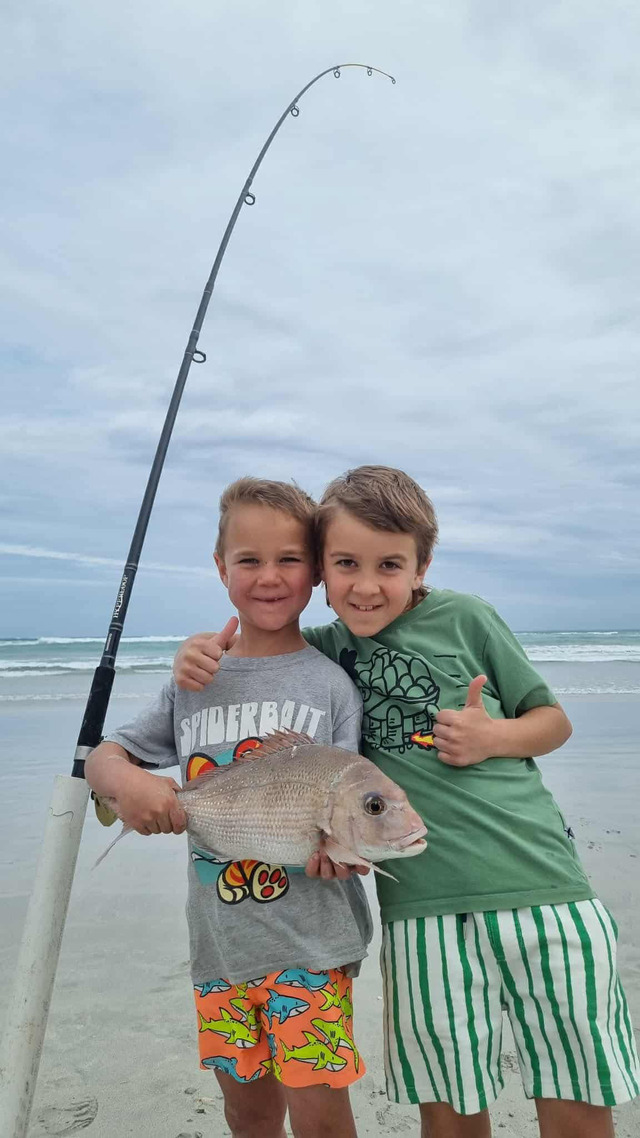 Hamish and Rufus Bowman with a nice snapper. (Supplied)