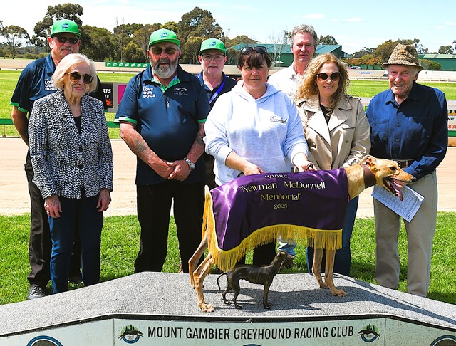 The Newman McDonnell Memorial presentation – Margaret Considine with family members on the right, John, Emma and Ellis pictured with MGGRC president Noel Perry, handler Steve Bartholomew, MGGRC club manager Tim Lewis and part-owner Deb Hicks with Littlefoot and “Oliveen”. (Supplied)