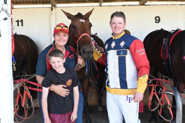 IT was a happy trio of Rebecca East (trainer), Jayson Finnis (driver) and Jayson's son Judd after the win of Famous Label at the Greenwald Paceway on Tuesday night. For Finnis, it was his last local winner prior to moving to Queensland next week with his family. (James Murphy 525636)