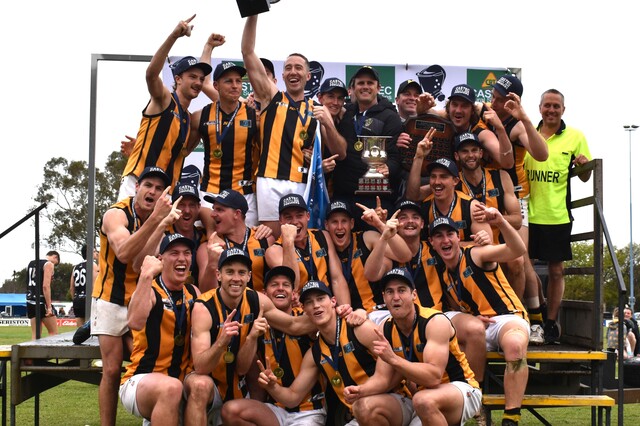 Mundulla players celebrate their 2025 grand final victory. (Ace Coote)